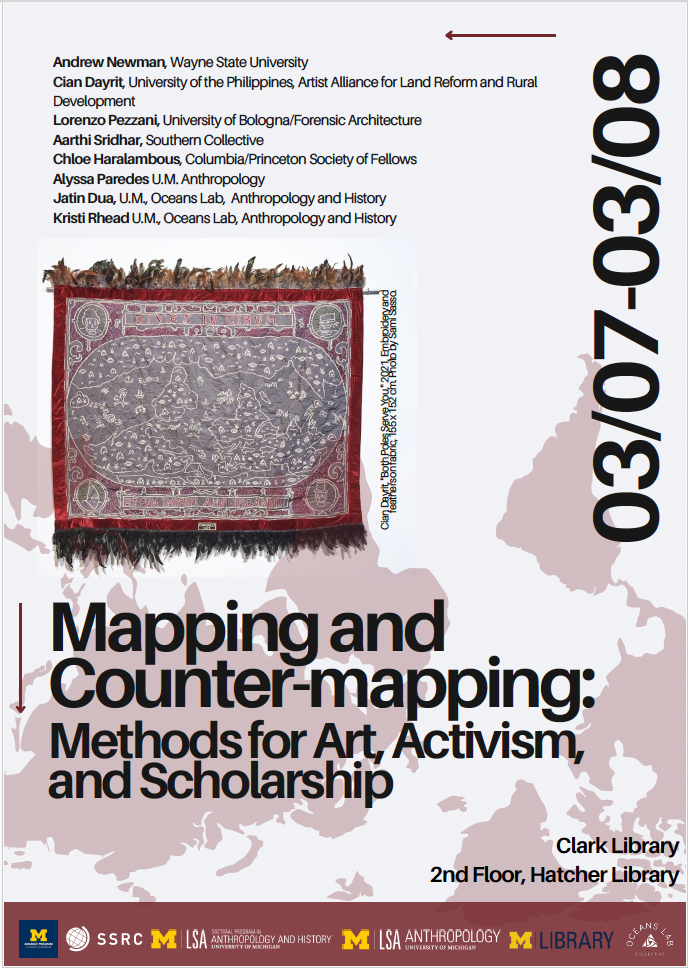 Mapping is a mode of storytelling. Yet, cartography is often concentrated in the hands of the powerful. In response, “counter-mapping” has developed as a practice that empowers communities to challenge hegemonic narratives about space and foreground subaltern knowledge. Through this 2-day event, faculty, students, and practitioners explored how mapping and counter-mapping might contribute to ethnographic and historical research. They also explored how art, activism, and scholarship help give these material objects a political afterlife. The event included a series of talks, a graduate student counter-mapping workshop, and a roundtable discussion.